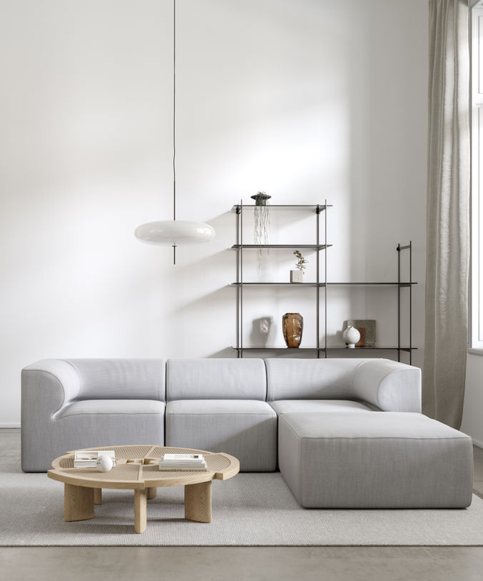 Pale interior concept residence is fluid and minimalistic, with tactile elegance emphasize on bright architectural aesthetic encompassing living, kitchen and dining room in an open space with no official dividing. The neutral Pale palette is displayed through raw materials including concrete, dry-shade terrazzo, glass, wood and plaster. Natural stone and concrete floors reflect natural light from full-height arch shaped openings bringing nature’s influence inside the house and referencing the colours of Nordic ambient. For the furnishing layout we pumped most of our items from Danish design brands. You’ll spot some design pieces by Bolia as the Herringbone Patterned Bar cabinet by the Luxe series combined with the Calice vase in warmth orange and the rod bookcase of glass and powder coated steel that lays behind the Eave modular sofa by Menu. We chose the PP589 Bench an iconic decades-old design from 1953 which originally conceived by Hans Wegner. Some decorative props are the Criver sculpture and the Sphere Vases from 101 Cph. Additionally we implement some furniture pieces with viennese weave that creates a mute and calm effect among the rough concrete surfaces.